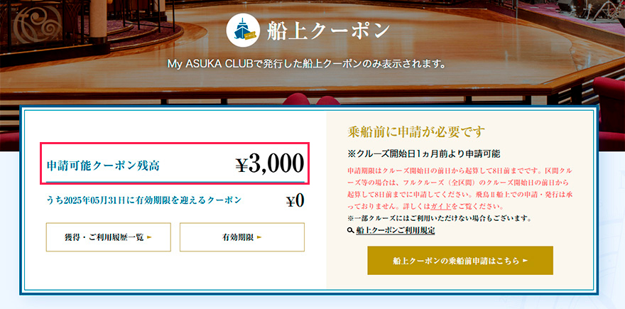 - 申請を済ませた船上クーポンは「申請可能クーポン残高」「現在のクーポン残高」には表示されなくなります。