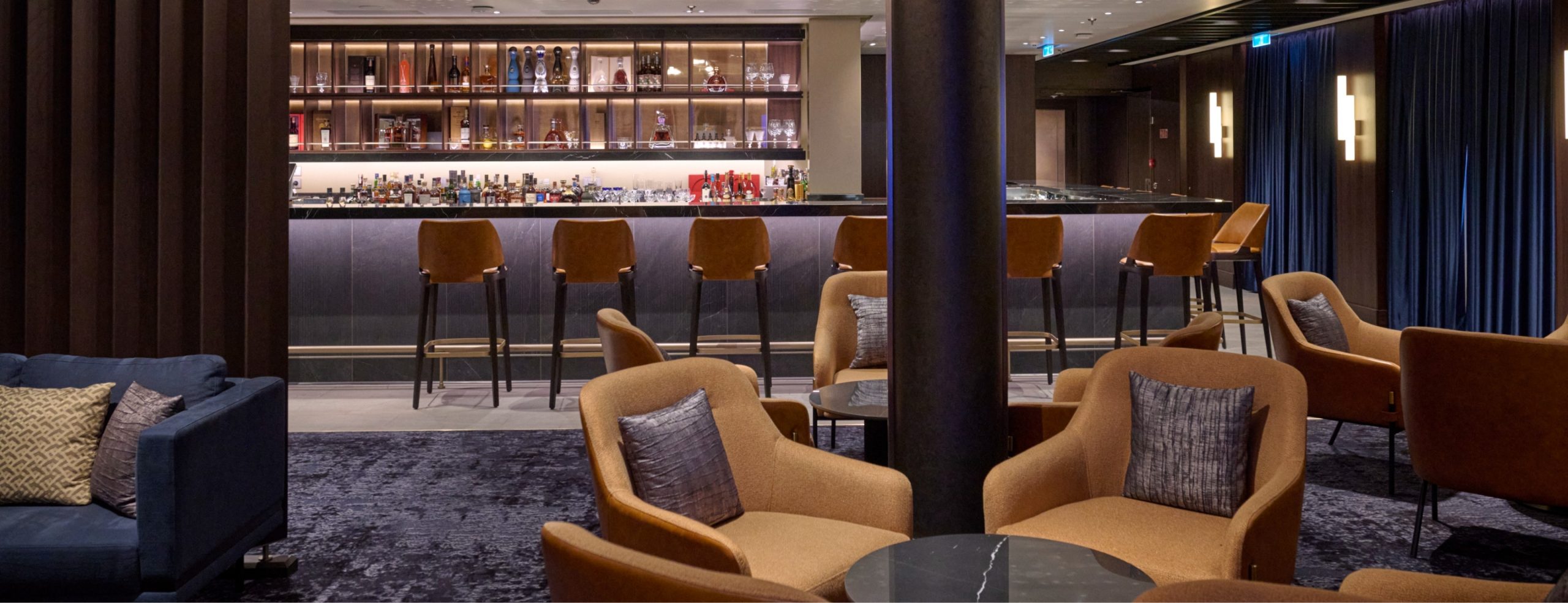 「飛鳥Ⅲ」は最新の技術を備えた新世代客船です。高速通信設備、優れた安定性と静音性により、お客様によりラグジュアリーな快適性を提供できるようになりました。そして外せないのが、美しい芸術作品の数々です。特に船の中心に位置する三層吹き抜けのメインアトリウムは、思わず吸い込まれるような美しさ。人間国宝 室瀬和美氏による壮大な漆芸作品が鎮座し、船内を彩る芸術作品からレストランやバーでお使いいただく器まで、「本物」へのこだわりが船内の至るところに息づいています。メインバー「マリナーズクラブ」で使用しているバカラのグラスは「飛鳥Ⅲ」限定の復刻品の1つです。私自身、器やグラスの収集が趣味でもあり、料理・空間・器、すべてが調和した最高品質の食卓は、どなたにも自信をもっておすすめできます。