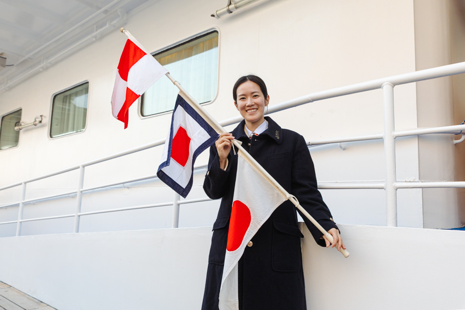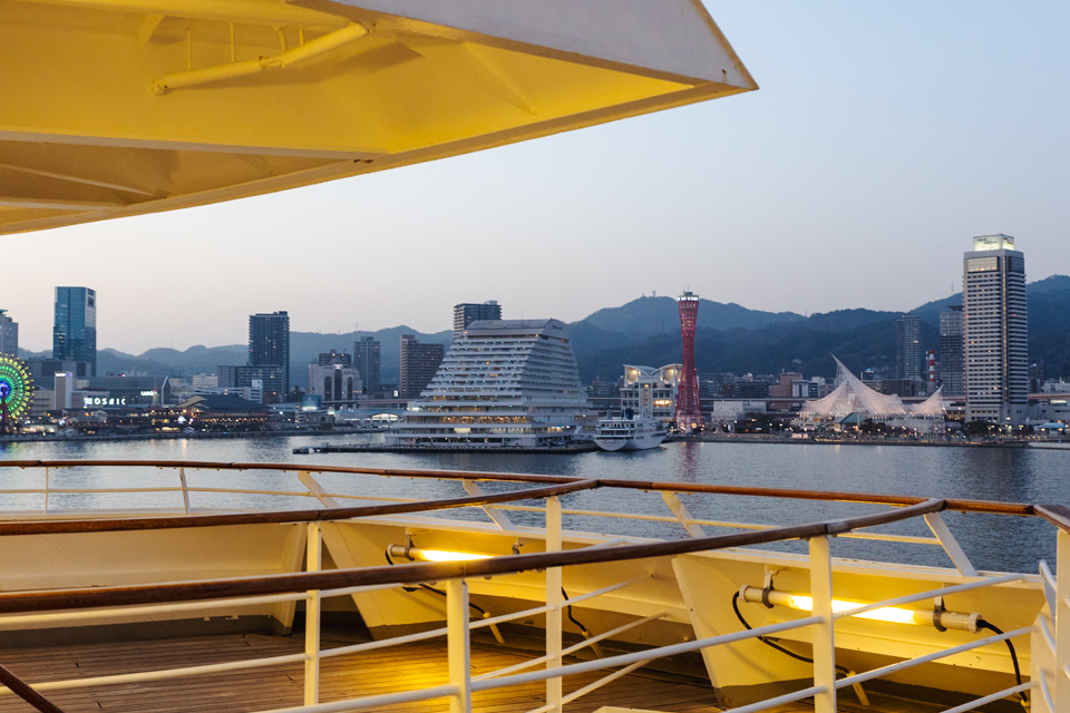 出国審査と乗船手続きが重なるため、神戸出港は夕方の17時。西日が港一帯をオレンジ色に染めるなか、横浜と同様、華やかなセイルアウェイ・パーティーがプロムナードデッキで催されました。乗組員が手にしていたのは船同士や船と陸上の間でメッセージを伝える国際信号旗。「ご安航を祈る」という陸上からのメッセージに合わせて、謝意を伝えていたのでした。 いよいよ出港というそのとき、筆者の周囲にいたお客様が何やらざわつき始めました。向かいのホテルからウェディング姿の新郎新婦が姿を現し、こちらに手を振ってくれていたのです。スペシャルゲストの登場にお客様は大喜び。「おめでとう!」の声があちこちから飛び交うユニークな船出は、まるで本クルーズの幸先を祝うようでもありました。