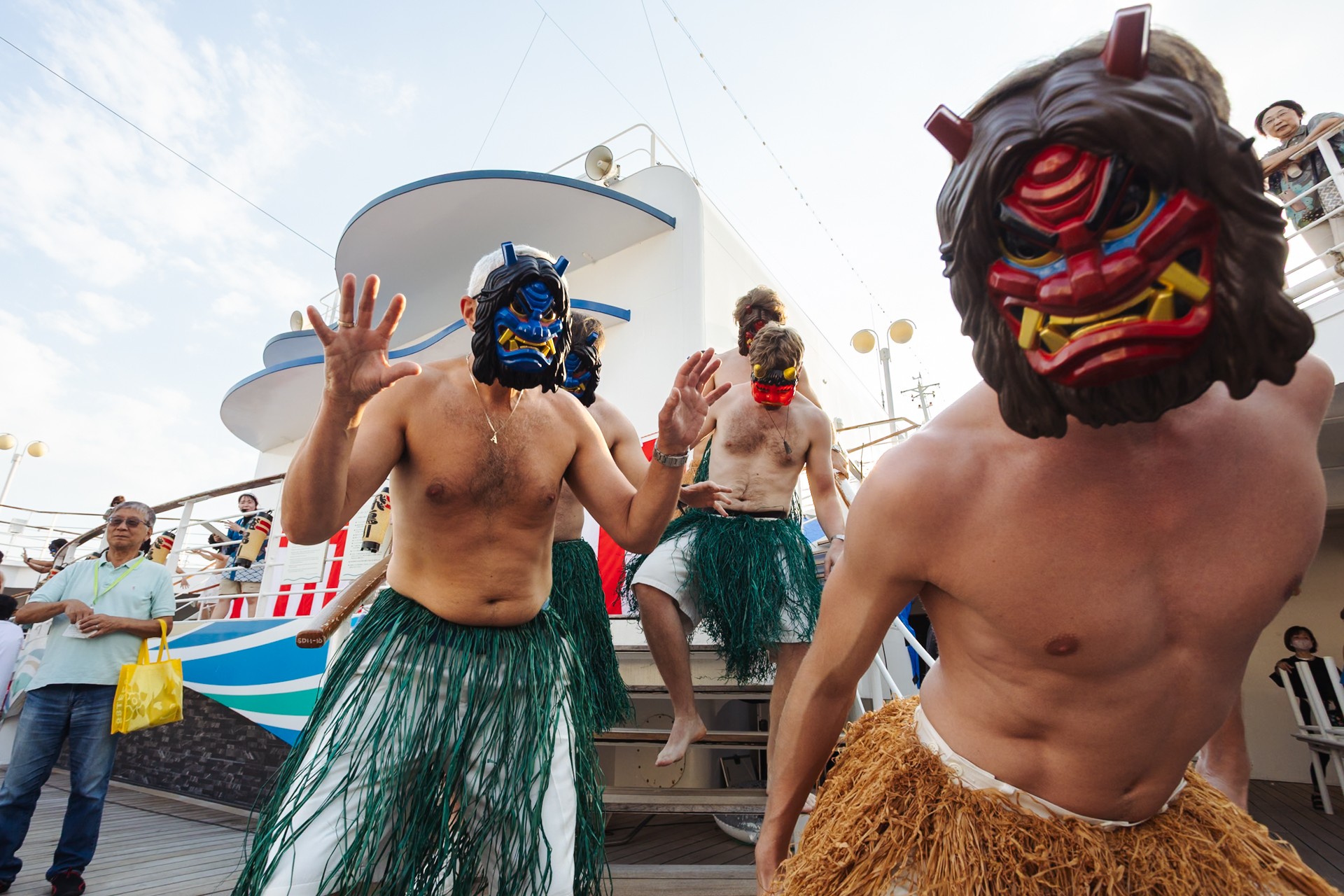 寄港地滞在の余韻も冷めやらぬなか、船上でも旅を彩るイベントが目白押し。2月3日といえばそう、節分です。セイルアウェイ・パーティー会場には大勢の鬼たちが突如出現!お客様が一丸となって豆をまき、邪気を払って福を呼び込みました。さらに終了間際には、誕生日を迎えた乗組員が鬼たちに担がれて、手荒い祝福を受けながら退場していく一幕も。