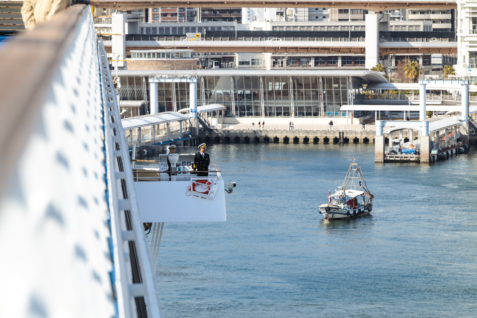 予定より1時間近く早まり、朝8時過ぎに「飛鳥Ⅱ」は神戸港 中突堤旅客ターミナルに着岸。神戸で下船されるみなさま、長旅お疲れ様でした!日常へと戻っていくお客様の後ろ姿に、つい重ねてしまうのは、あと1日に迫った自身の旅の終わり。午後になり、いつの間にか東に影が伸びた風景を眺めながら、本船は13時45分に横浜港へ向けて出港しました。