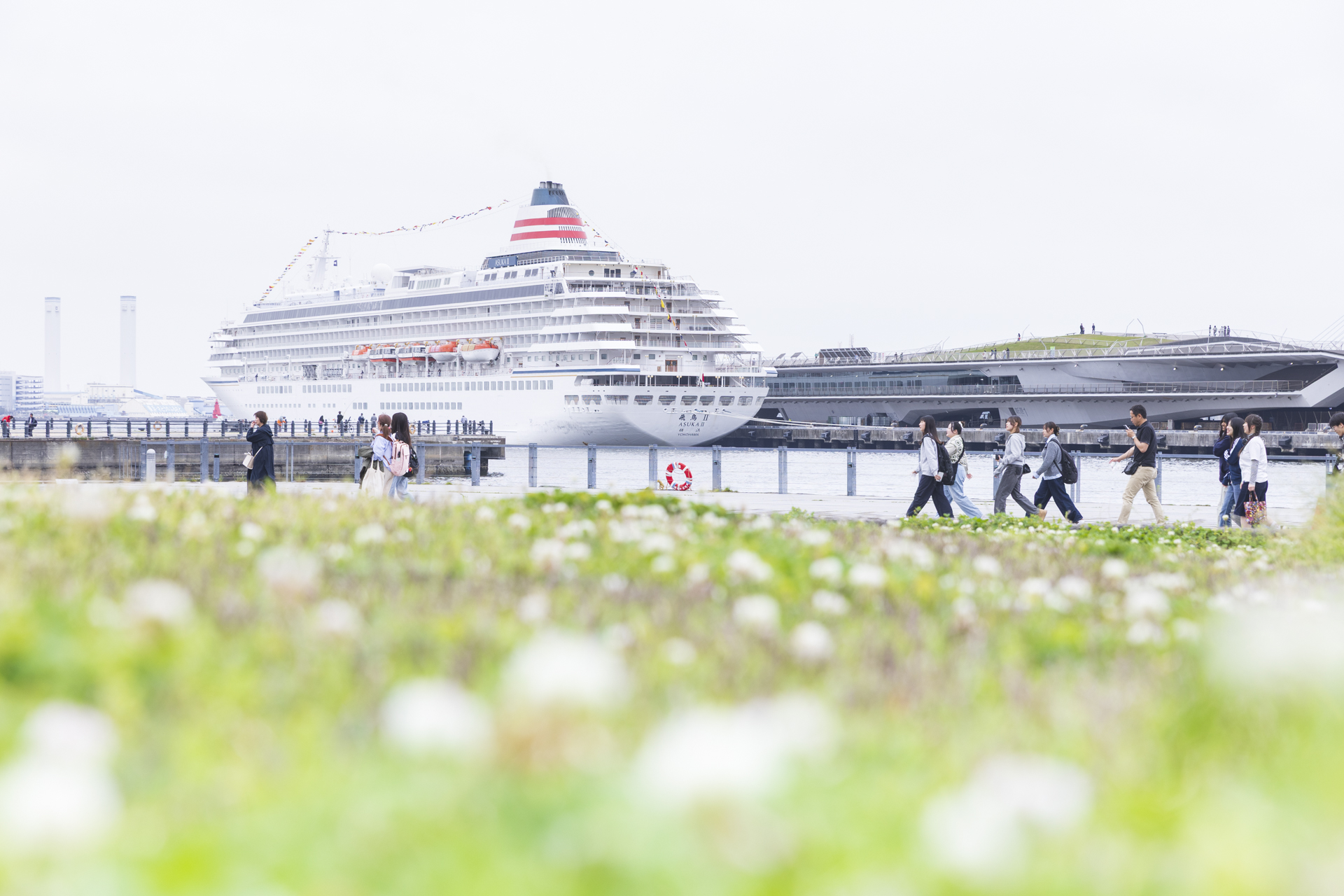 きょうは待望の「飛鳥Ⅱ」の2026年アラスカ・ハワイグランドクルーズが始まる日。母港の横浜は前日の雨も止み、時折晴れ間も見えるまずまずの天気です。赤レンガ倉庫から大さん橋にかけての海辺には多くの人が楽しそうに行き交っていて、出港気分に華を添えています。筆者は出港前に象の鼻テラスに立ち寄って、芝生のグリーン越しにパチリと1枚、優美な船影をカメラに収めました。