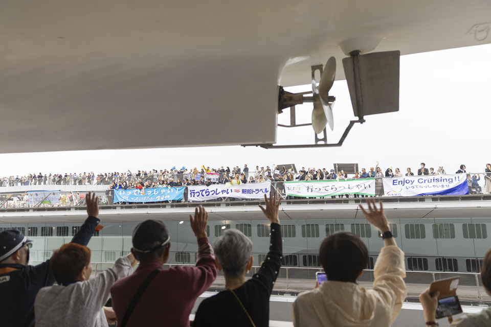 さて、大さん橋へと向かう道には、カジュアルながらも着飾った姿でスーツケースを転がす多くの方が……。きっと、いや間違いなく、「飛鳥Ⅱ」にご乗船のお客様でしょう。ターミナル内でも、船へと入ってからも、楽しそうな話し声が聞こえてきます。初乗船の期待感を抱えた方々はもちろんのこと、「今回もまたご一緒ね」と再会を喜び合うリピーターのお客様もいらしたようです。