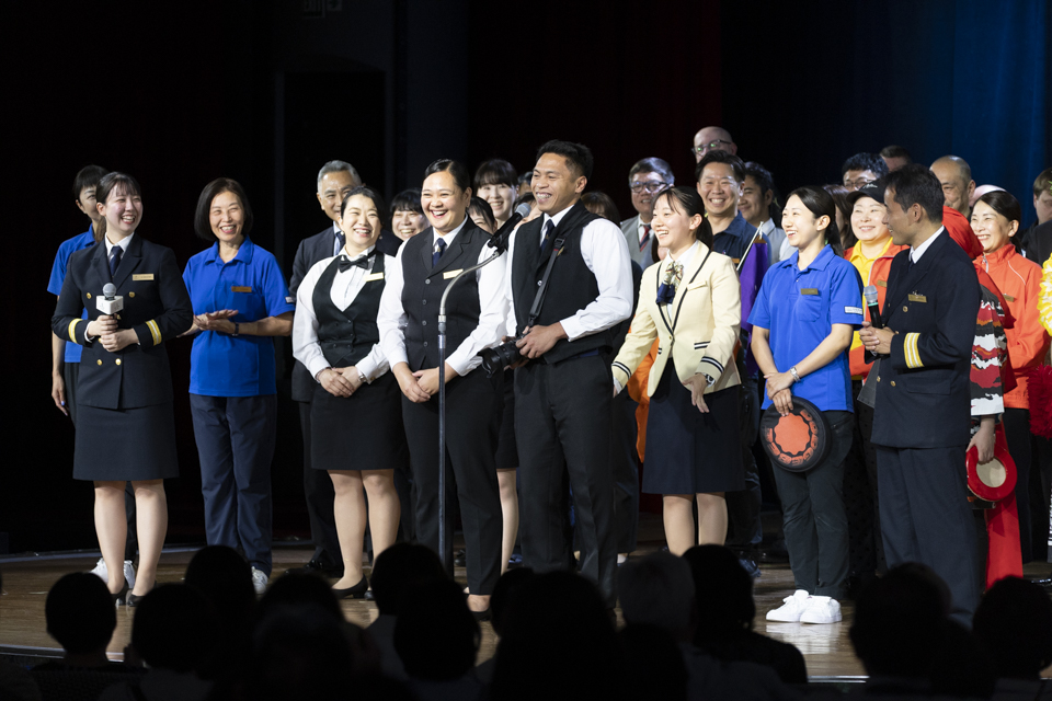 しゃぼん玉やバルーンが舞い、「行ってらっしゃい!」「行ってきます!」の声が響くなか、「飛鳥Ⅱ」は定刻17時に大さん橋を離れました。消防艇の見送りの放水を横目に横浜ベイブリッジをくぐり抜け、東京湾から太平洋へ。船内では、スタッフ紹介もありました。きっと猛練習したのであろうフィリピン人クルーの流暢な日本語による自己紹介も微笑ましく、惜しみない拍手が送られていました。