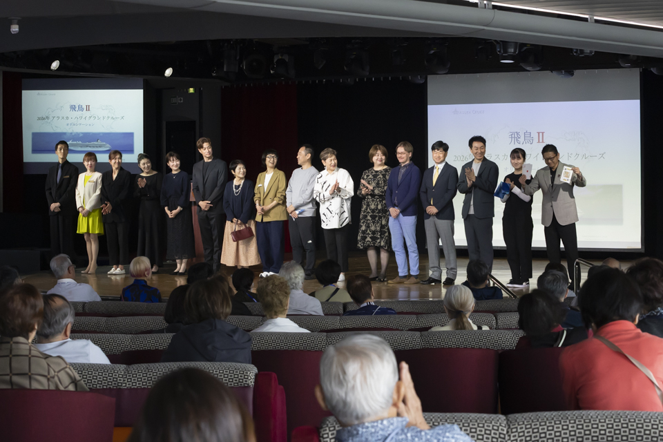 午後は晴れて、「おそらくハナゴンドウでは?」と詳しいクルーが話す、イルカとクジラの双方の特徴をもつ海洋生物の群れも見えました。そしてきれいな夕日に加え、「見ると幸せになれる」と言われるグリーンフラッシュも……。いろいろ見られて早くも幸先のいいクルーズです。夜には改めてアスカプラザで今航の前途を祝し、キャプテンらによる鏡開きが行われました。