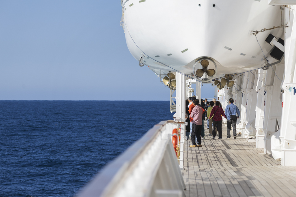 昨夕に横浜を出た「飛鳥Ⅱ」は太平洋を北東へと進んでいます。毎朝8時50分のキャプテンによる定時の放送では、「黒潮の流れを後ろから受けて快調に航行を続けている」とのこと。クルーズ2日目のきょうが、実質的な船内生活の始まりの日です。午前中にはスタッフキャプテン(副船長)やドクターらによる船内生活オリエンテーションがありました。