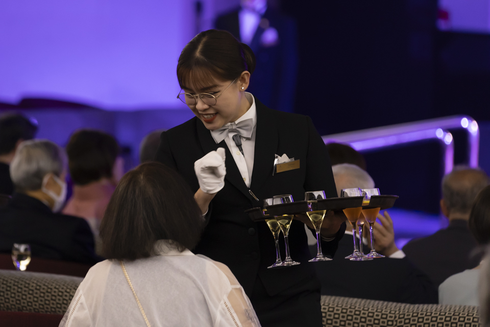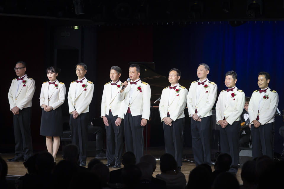 キャプテンズ ウェルカムパーティーではオフィサー陣が揃ってお客様にご挨拶したほか、声楽アンサンブル「オペラ ヴォーチェ」の4人によるステージも。レセプション前での楽しい歓談、フォーシーズン・ダイニングルームでの美味しい洋食フルコースディナー、オフィサーたちと踊れるフォーマルダンスタイムなど、どなたも心ゆくまで楽しまれたことでしょう。