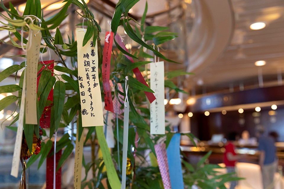 そして何と「僕の誕生日が消滅しちゃった」という笑い話をお客様から聞きました。もちろん、きちんとお祝いしてもらえたとのことで、ひと安心。レセプション前には七夕飾りも用意され、季節の移ろいを感じます。午後には専属マジシャン・TAKUYA(渡邊卓也)さんによる少人数制の教室が催されていたのも新鮮でした(写真右下)。