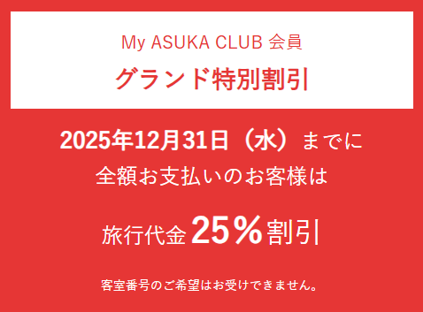「飛鳥Ⅱ 2026年 アラスカ・ハワイグランドクルーズ」のMy ASUKA CLUB会員グランド特別割引の期限が2025年12月31日(水)まで延長となりました。