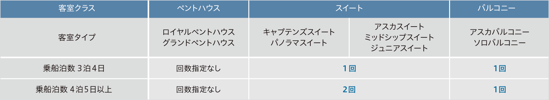 「My ASUKA CLUB」プラチナ会員およびアルバトロス会員のお客様の乗船前予約回数はスイートクラスに準じます。