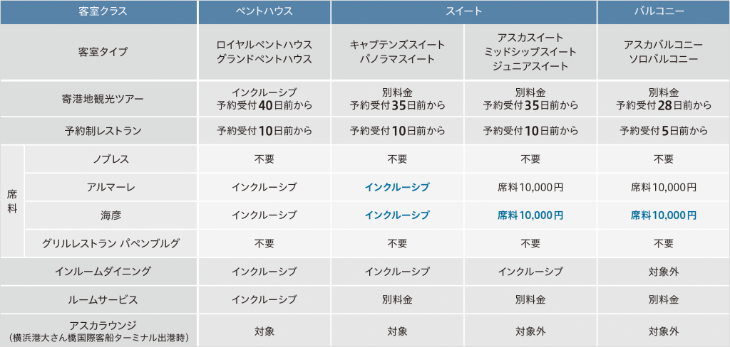 「My ASUKA CLUB」プラチナ会員およびアルバトロス会員のお客様の予約受付はスイートクラスに準じます。予約制レストランの席料はお申し込みの客室タイプに準じます。