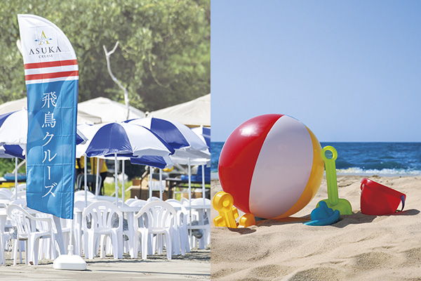 「飛鳥Ⅱ」のお客様だけのビーチエリアをご用意。パラソルや椅子などが並び、ゆったりとお過ごしいただけます。海遊びやバナナボート、ビーチアクティビティに参加するのもおすすめ。好奇心のままに海を楽しもう!